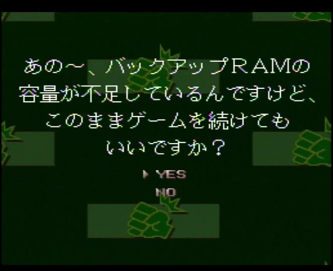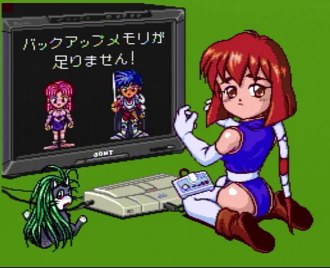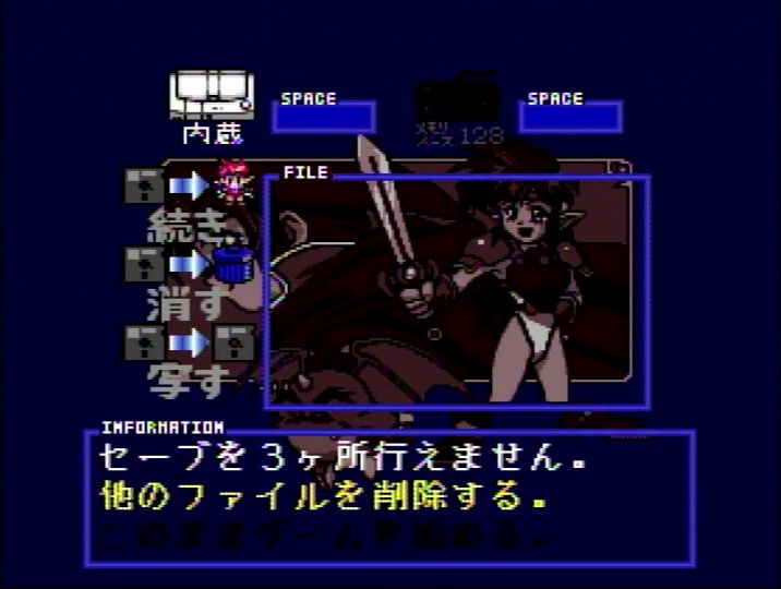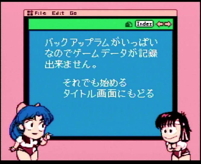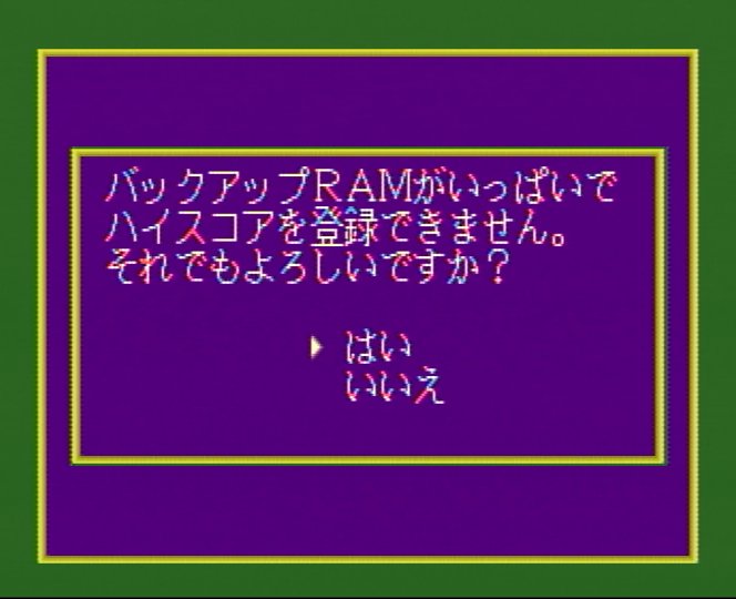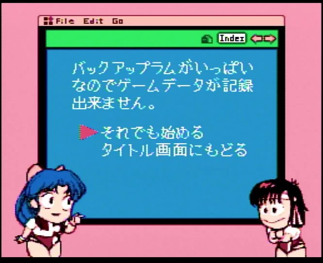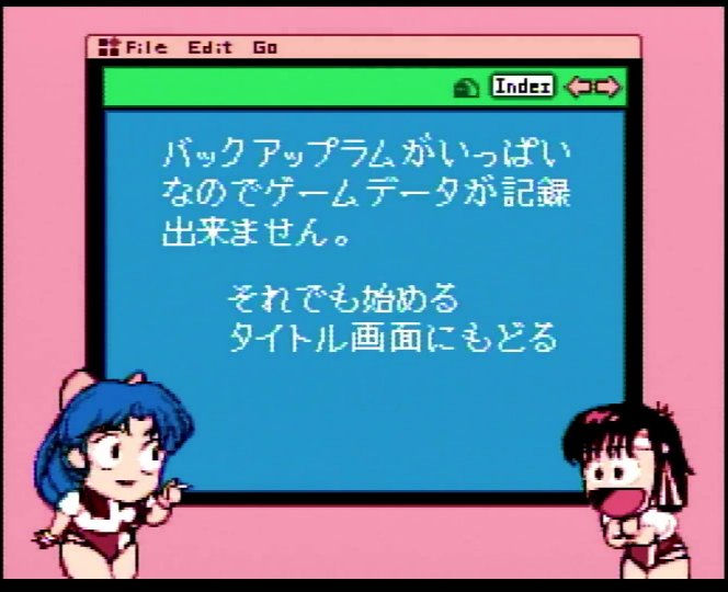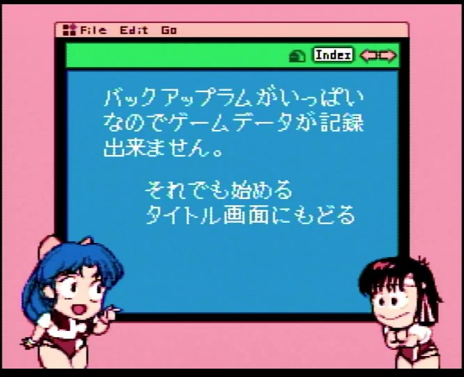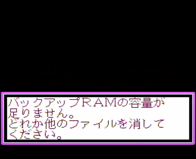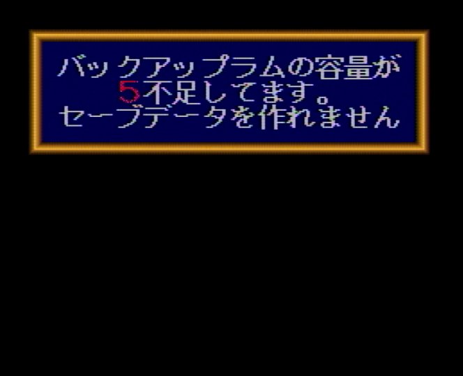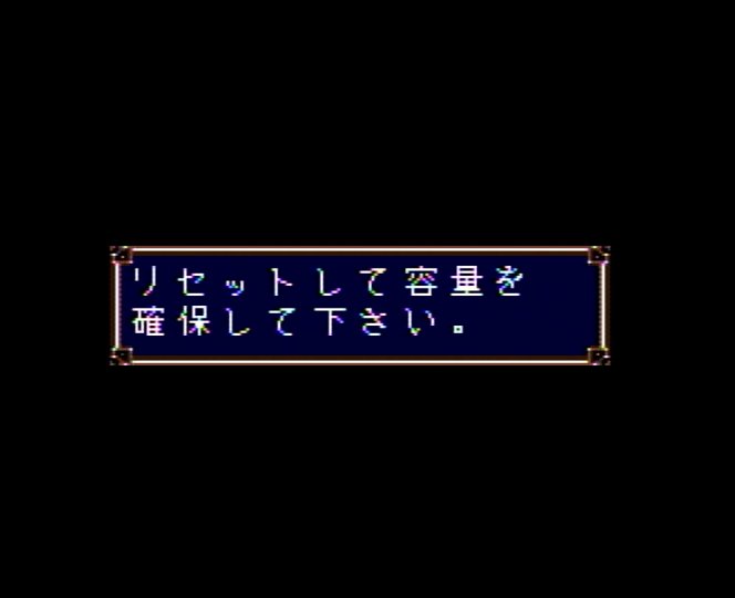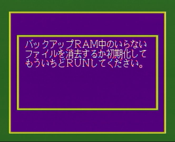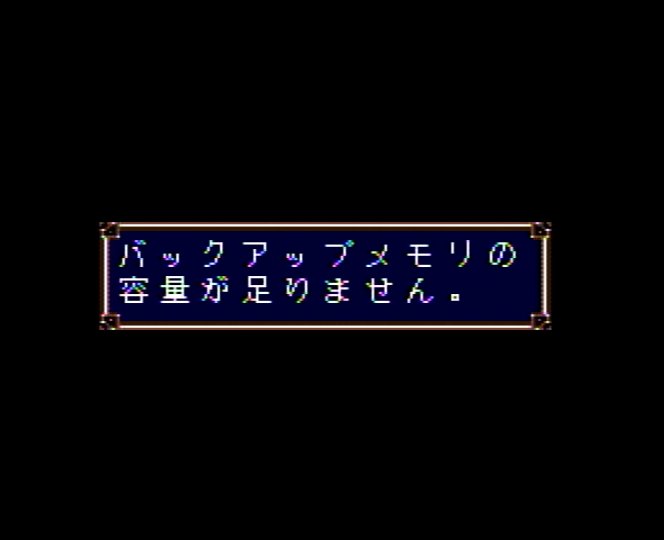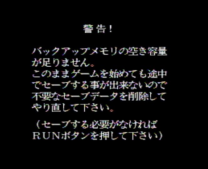 | The BACKUP RAM has too much data. This data cannot be used. | Here's how you can use this data: | Please press the Select Button on the title screen of the CD-ROM SYSTEM. | Then, if you select 'Delete' at the BACKUP RAM, all stored data will be displayed. | Select the data you no longer need and delete it with the I button. | In Tengai Makyou, data is stored under the names "TENGAI1" to "TENGAI4". |