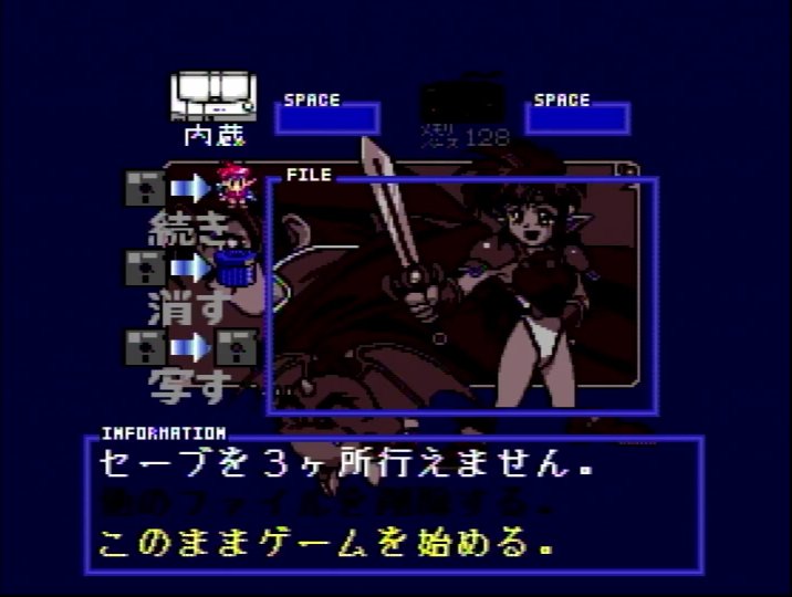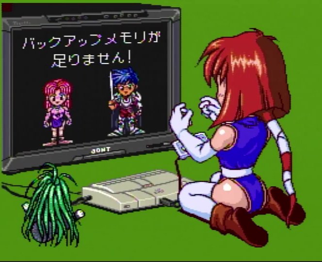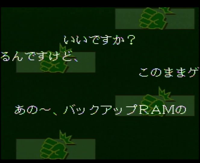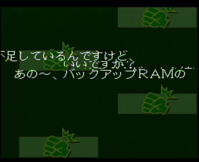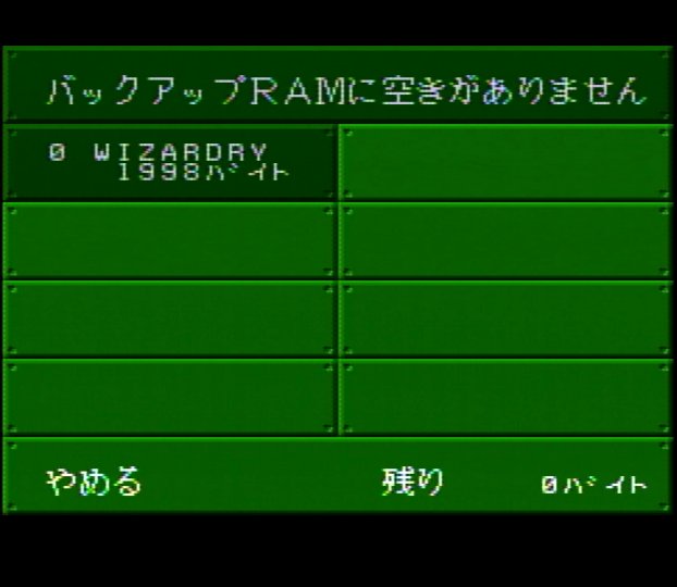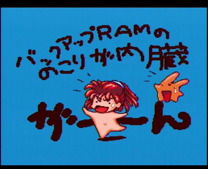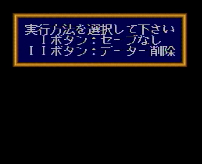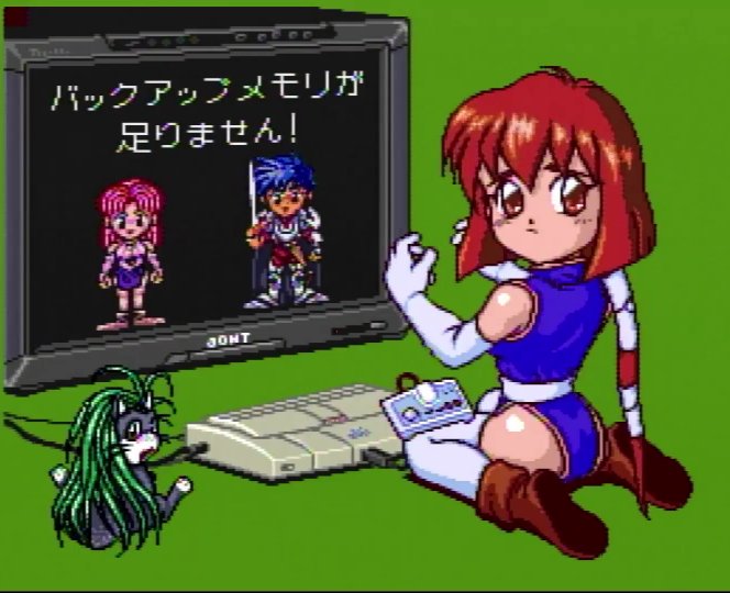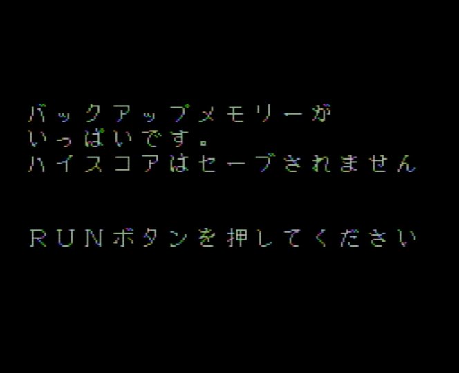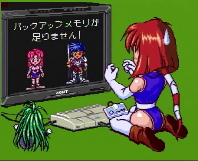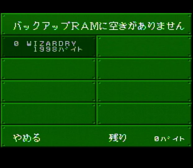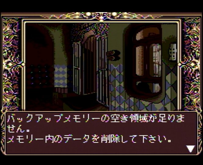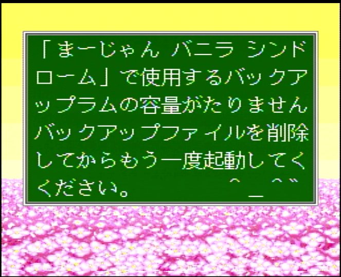 | The BACKUP RAM has too much data. This data cannot be used. | Here's how you can use this data: | Please press the Select Button on the title screen of the CD-ROM SYSTEM. | Then, if you select 'Delete' at the BACKUP RAM, all stored data will be displayed. | Select the data you no longer need and delete it with the I button. | In Tengai Makyou, data is stored under the names "TENGAI1" to "TENGAI4". |