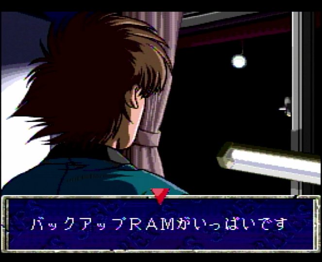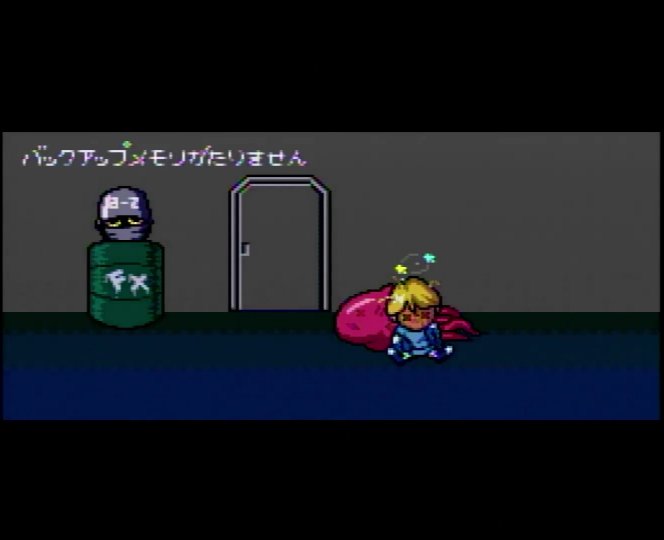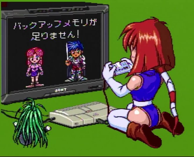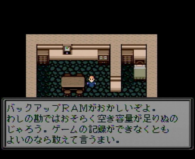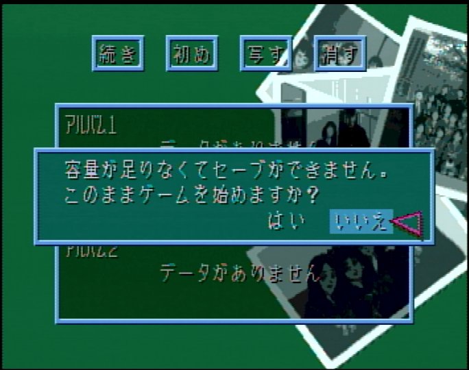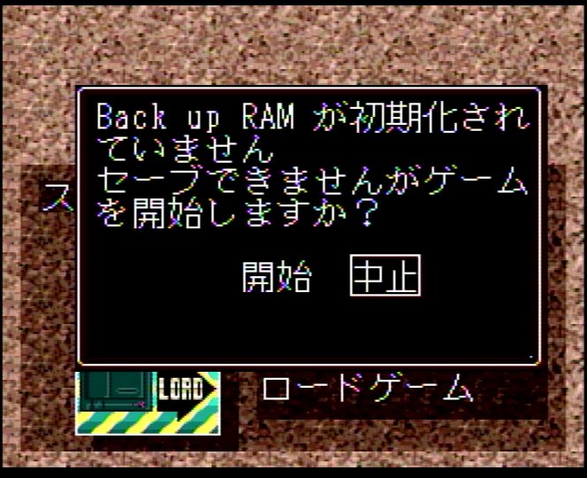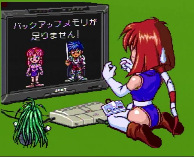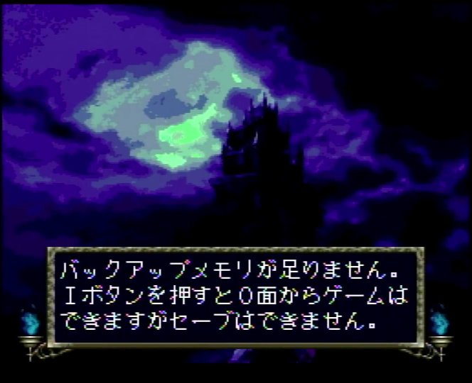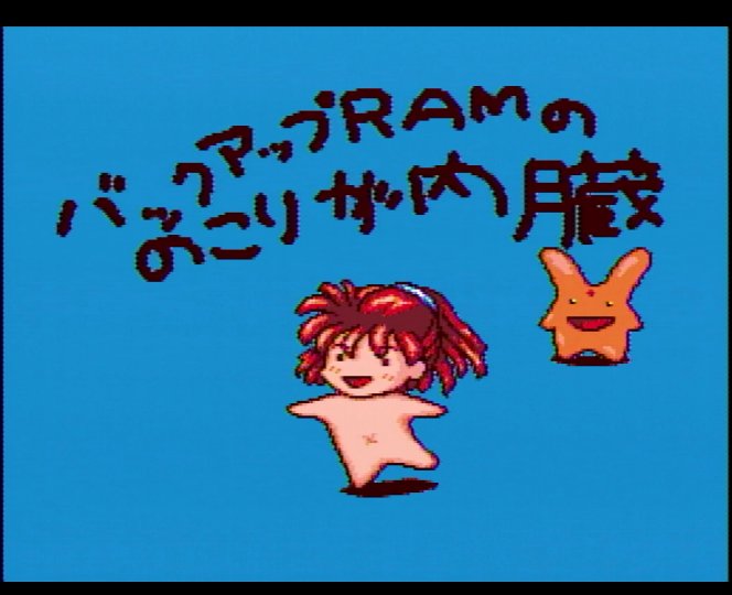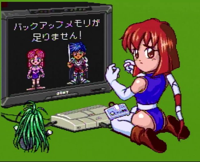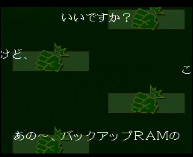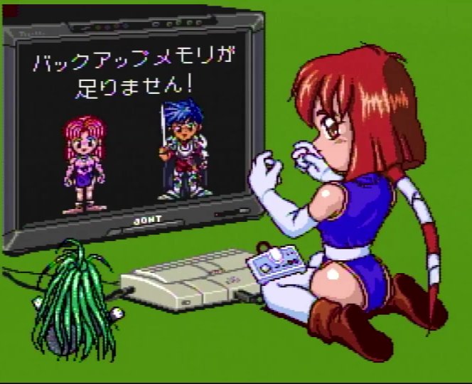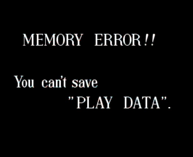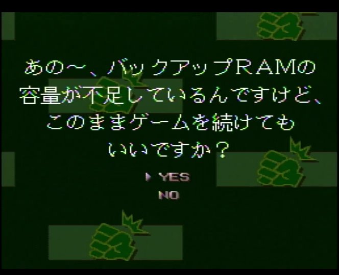 | The BACKUP RAM has too much data. This data cannot be used. | Here's how you can use this data: | Please press the Select Button on the title screen of the CD-ROM SYSTEM. | Then, if you select 'Delete' at the BACKUP RAM, all stored data will be displayed. | Select the data you no longer need and delete it with the I button. | In Tengai Makyou, data is stored under the names "TENGAI1" to "TENGAI4". |